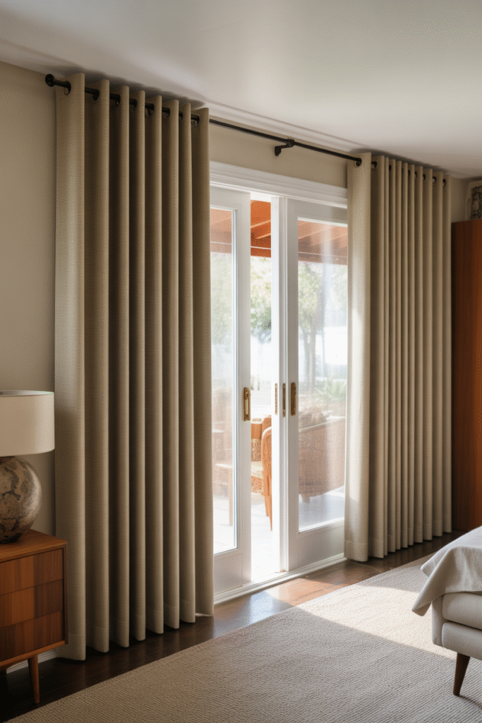Mid-century spaces love vertical lines and natural texture. Full-length linen or linen-blend drapes create a quiet, continuous drop that flatters low and high ceilings alike.