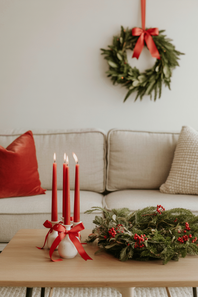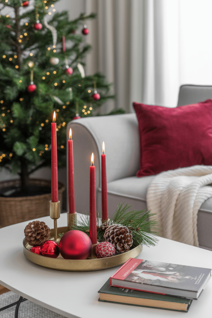 Your coffee table is prime real estate for creating a small but impactful Christmas vignette. Start with a neutral base — maybe a tray or stack of winter-themed books — then add red details like candles, small ornaments, or ribbon-tied pinecones.