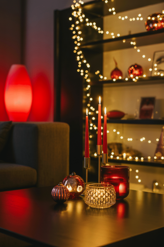 Want something extra festive? Try a subtle red glow behind your TV or under shelves using smart LED strips — it feels modern and adds holiday ambiance without the clutter.