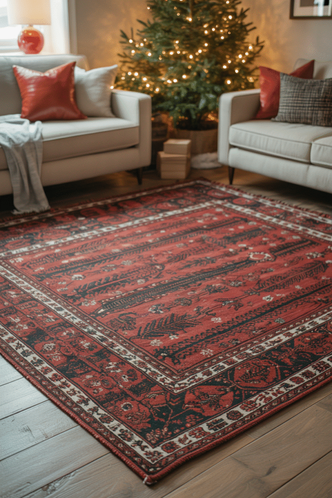 If your living room allows, a red area rug or accent runner can anchor your space and make everything feel intentional. It doesn’t have to scream “Christmas” — a simple Persian-style or plaid pattern adds warmth year-round but feels especially fitting during the holidays.