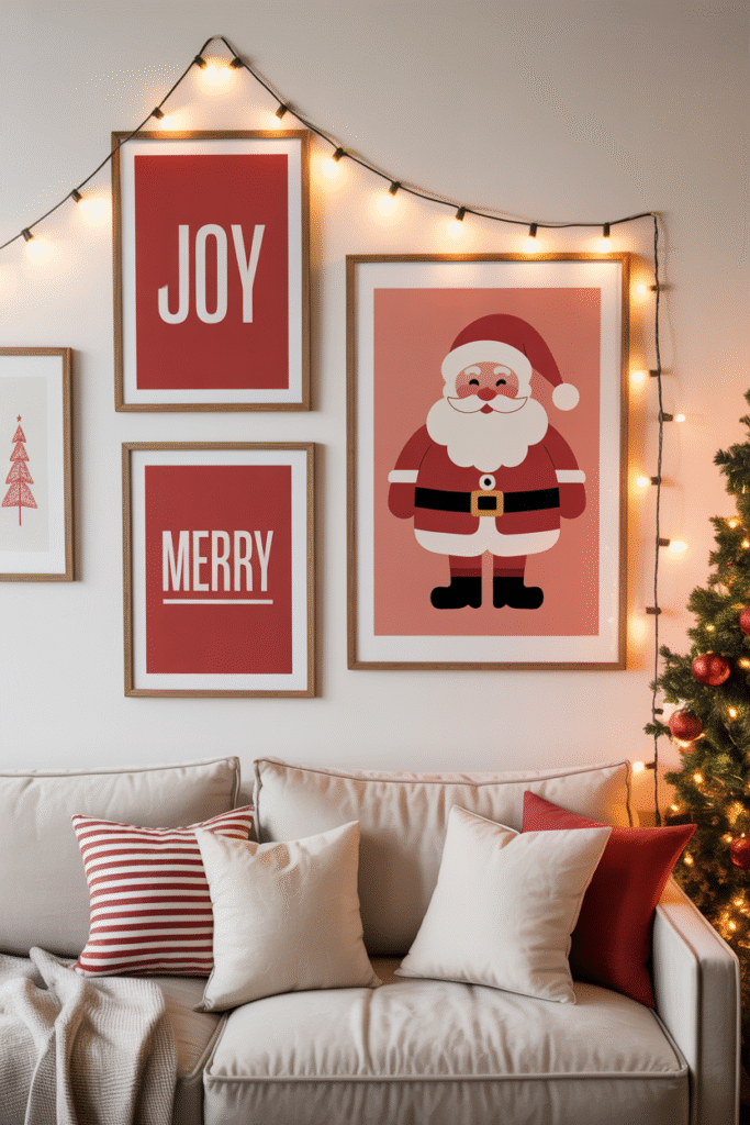 This is an underrated idea that makes a big difference. Temporarily replace your usual artwork with Christmas-inspired prints — maybe vintage-style Santa illustrations, minimalist red and white abstracts, or simple typography pieces that read “Merry” or “Joy.”