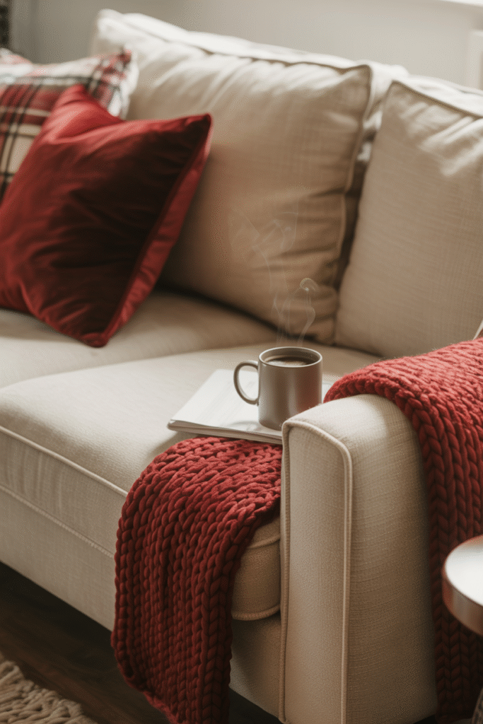 Mix and match a few throw pillows in different fabrics: think velvet for a touch of luxury, plaid for rustic charm, or knit for that handmade feel. Pair them with a chunky red throw blanket draped casually over your sofa arm.
