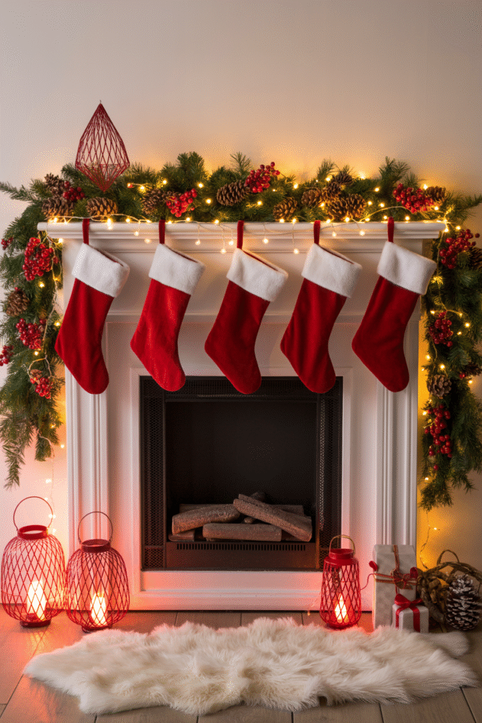 Add red candles or taper holders in different heights to draw the eye upward. Finish with stockings that echo the red tones — either classic bright red or deeper crimson for a moodier vibe.