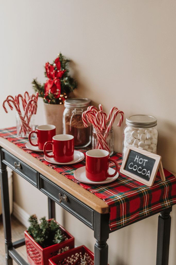 This one’s part decor, part pure joy. Dedicate a small console or side table to a mini hot cocoa station — with red mugs, candy canes, and jars of cocoa mix or marshmallows.