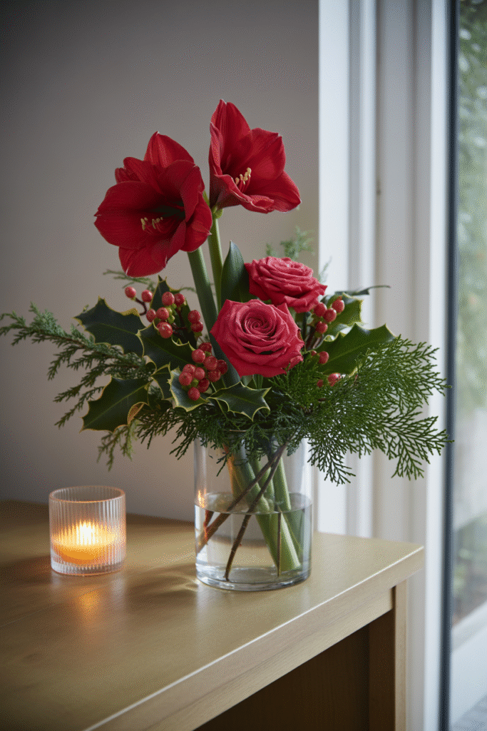 Why it works: Red flowers echo traditional holiday hues but in a softer, more organic way — perfect if you’re after a “festive but not flashy” look.