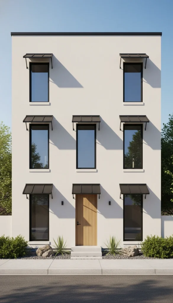 Add a matching slim awning over each main window for a minimalist row of “brows” that instantly upgrades curb appeal.