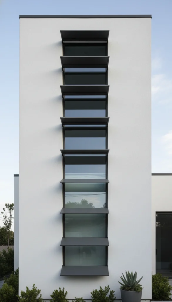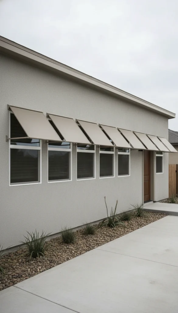 1. Slim Charcoal “Eyebrow” Awnings for a Soft Minimalist Look