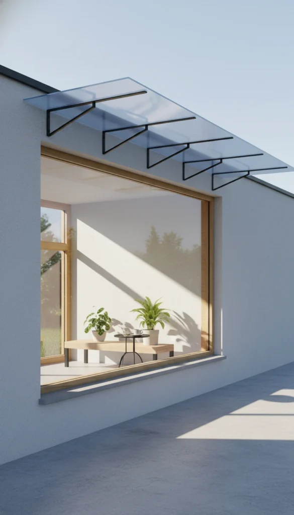 - Structure: A shallow metal or treated-wood awning with a built-in ledge along the top or just beneath