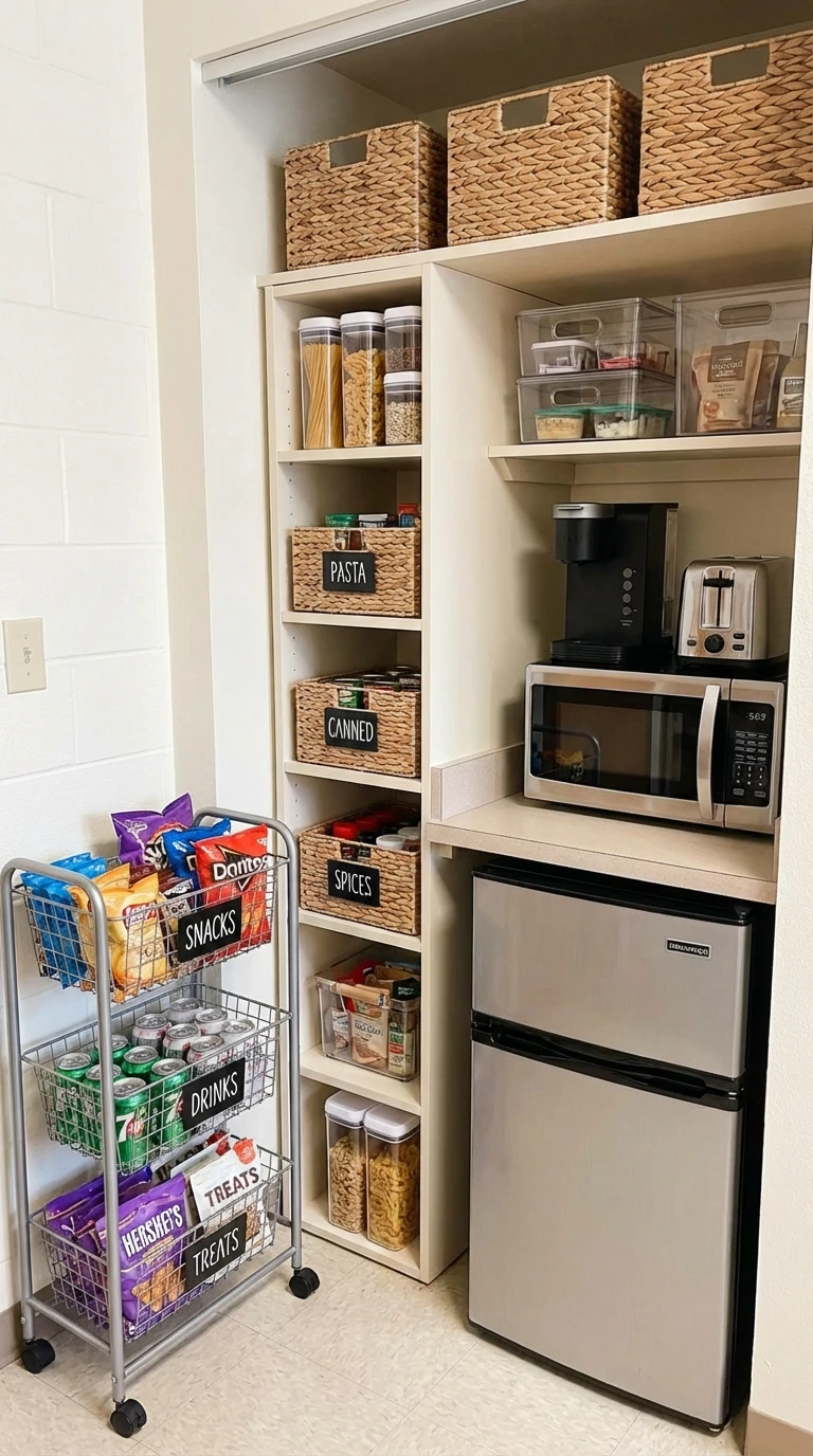 Even without a full kitchen, dorm room kitchen ideas small spaces can keep snacks and simple meals organized.