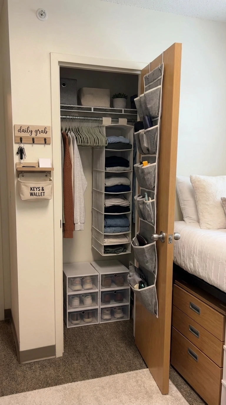 - Keep a “landing strip” (top of dresser or a slim shelf) for keys, ID, and snacks.