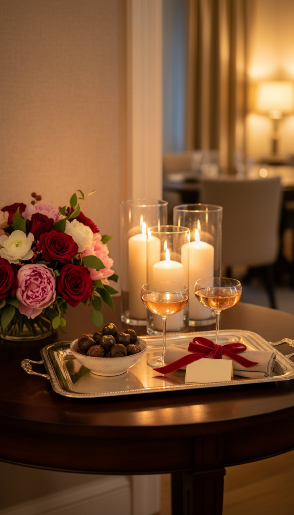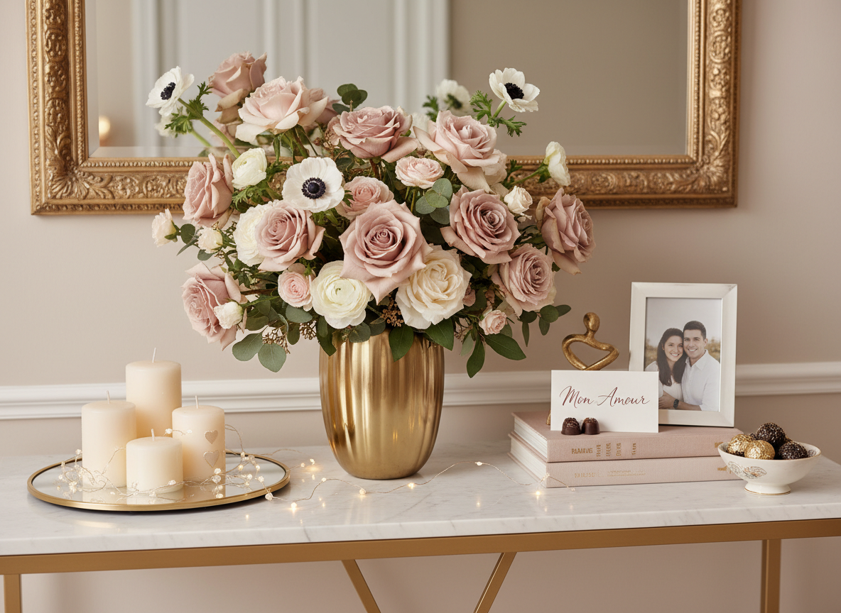 Chic touch: Use the 60/30/10 rule: 60% neutral, 30% warm metal/texture, 10% Valentine accent.