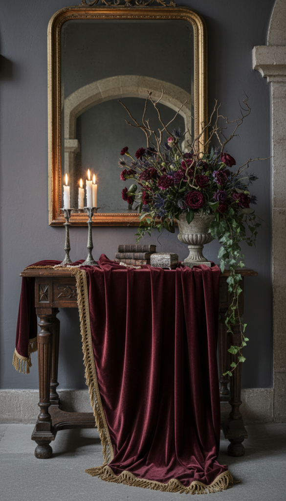 - Velvet ribbon or velvet runner (deep red, plum, or wine)