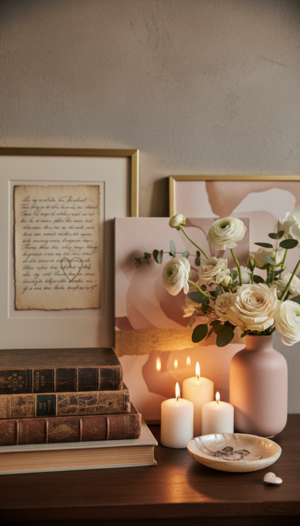 - Stack 2–3 books and top with a small object (mini vase, heart dish).