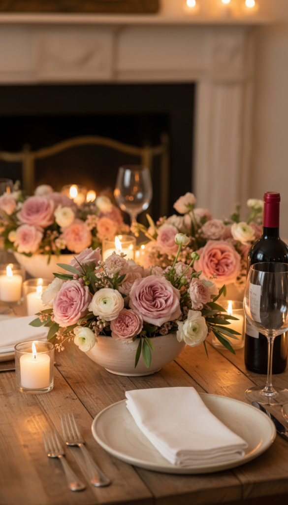 Tall centerpieces may look dramatic, but they disrupt intimacy. For Valentine’s Day, keep florals low and approachable.