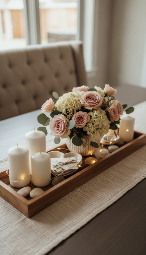 Instead of one centerpiece, use a decorative tray to curate a mini vignette. This keeps the look cohesive while allowing flexibility.