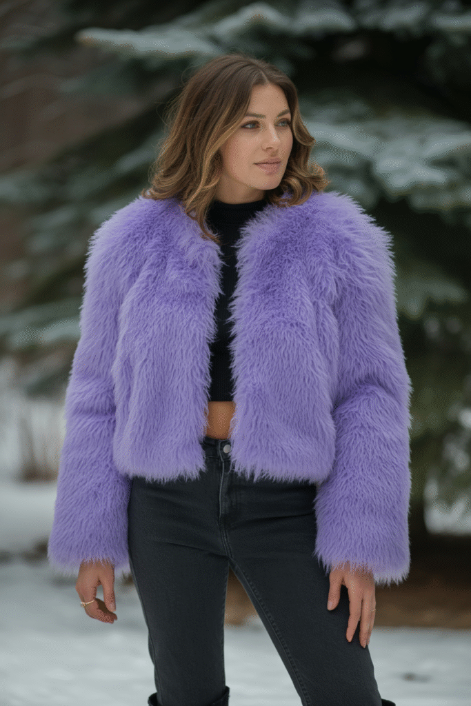 Faux fur isn’t just trim anymore—it’s the whole outfit. In 2025, women are embracing faux fur coats, hats, and even handbags in both classic neutrals and bold, playful colors. A cropped faux fur jacket in electric blue or lavender adds a whimsical touch to dreary winter days. Best of all, it’s animal-friendly and luxuriously warm.