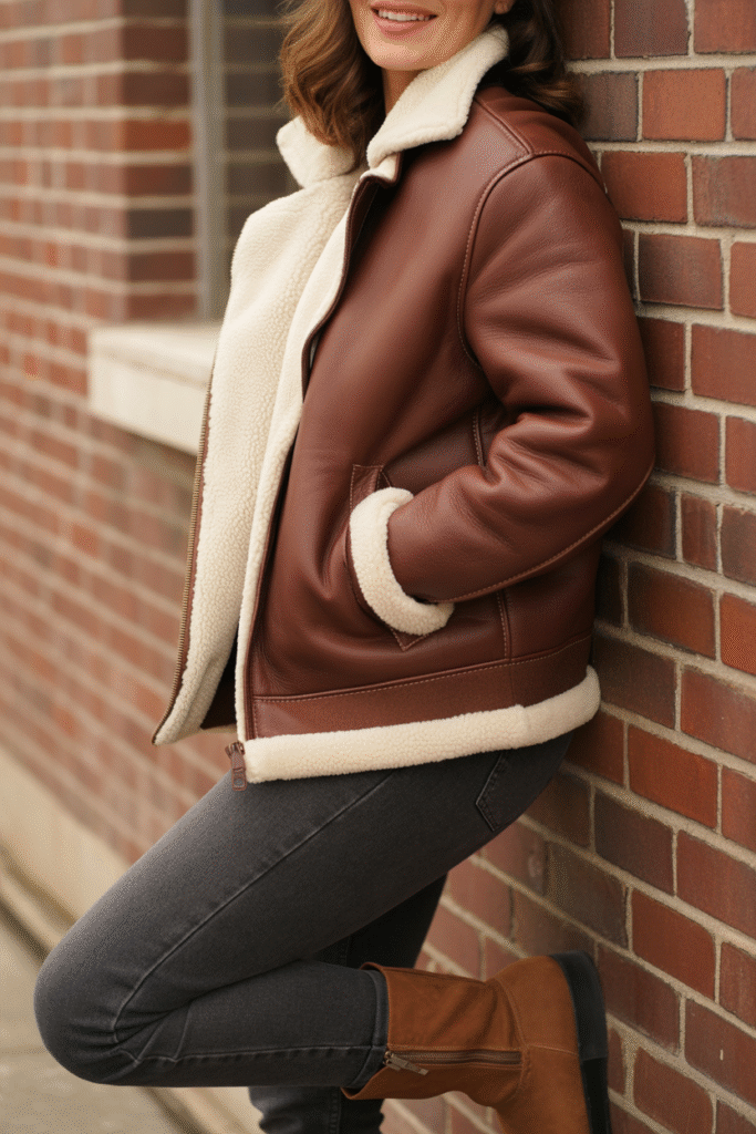 Shearling is one of those details that instantly screams winter, and in 2025, it’s showing up everywhere. Leather jackets lined with shearling, shearling-trimmed boots, and even handbags with fuzzy edges. The material adds instant coziness and a retro feel. A shearling-lined bomber paired with jeans and a knit beanie is a perfect weekend uniform.