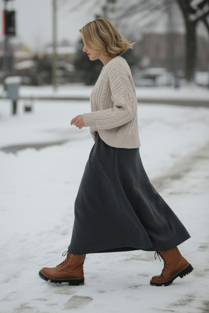 The maxi skirt—once reserved for summer—is getting a winter reboot. Paired with chunky boots and oversized sweaters, it’s both practical and stylish. Wool, tweed, or even velvet versions add texture and warmth. The silhouette feels romantic but grounded, especially when balanced with sturdy footwear. Think bohemian meets utilitarian.