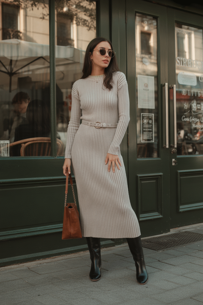 The knit dress has officially graduated from “comfy at home” to “street-ready winter staple.” In 2025, expect to see ribbed midi and maxi styles paired with knee-high boots. The look is streamlined, feminine, and warm without sacrificing elegance. Add a belt if you want to define the waist—or leave it relaxed for that effortlessly chic vibe.