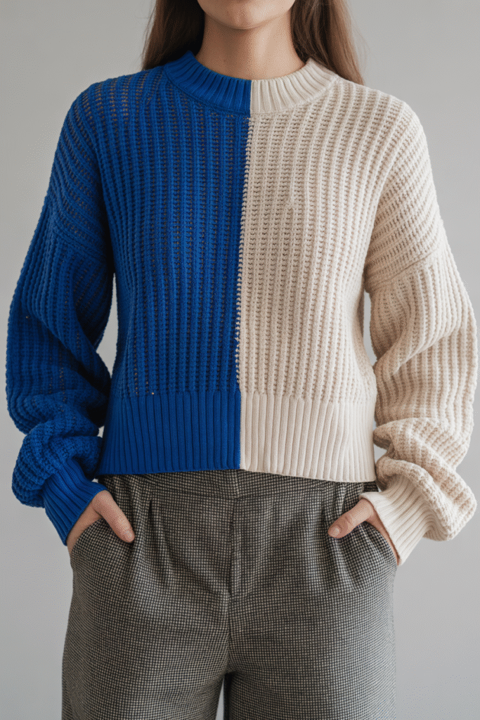 Winter can get a little gray, but color-blocked knits are bringing joy to 2025 wardrobes. Bold sweaters with contrasting sleeves, geometric patterns, or half-and-half color designs feel modern and playful. Women are styling them with jeans for casual days or tucked into midi skirts for a more polished look. It’s a trend that brightens up even the dullest morning commute.