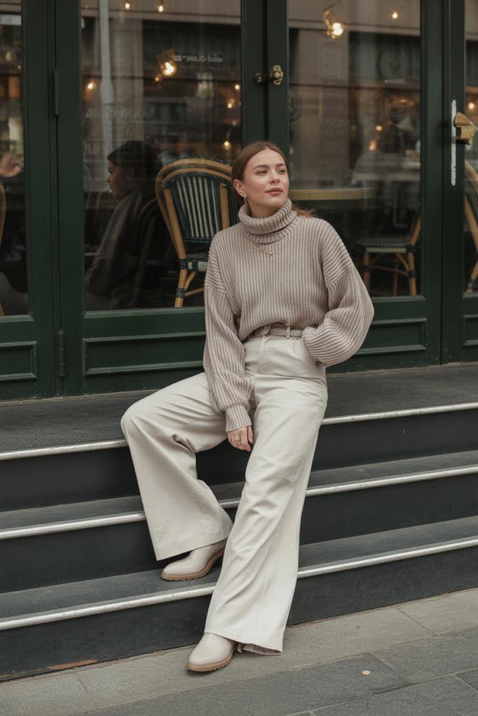 Move over skinny jeans—wide-leg trousers are running the show. Paired with layered sweaters (think: a chunky crewneck over a thin turtleneck), the result is relaxed yet refined. High-waist styles elongate the legs and work beautifully with heeled boots or sleek sneakers. Women love this combo because it’s both comfortable and office-appropriate.
