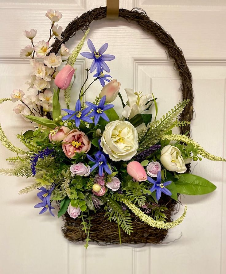 A flower basket door hanger brings instant charm and texture to a spring entryway. It feels natural, layered, and full of life—perfect for anyone who loves a softer, garden-inspired look without going overboard.