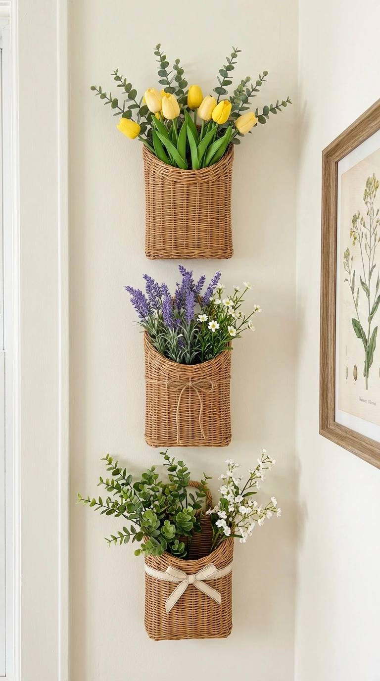 This one is a favorite for Crafts With Faux Flowers because it adds depth to a blank wall and still feels tidy. Think wall baskets, wall cones, or small hanging pockets filled with faux stems.