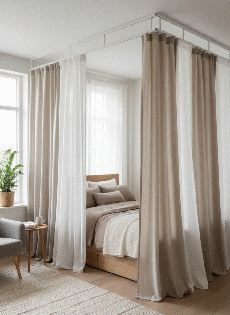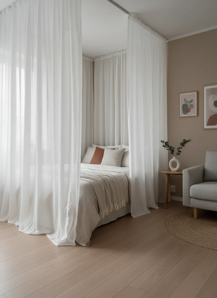 Creating a privacy cocoon with sheer curtains gives your bed a dreamy, hotel-like feel without blocking natural light. The fabric adds subtle movement and softness to a square room, instantly making the sleep zone cozier. Choose ceiling-mounted tracks to let the curtains float from corner to corner. White, cream, or soft warm greige sheers blend with nearly any palette while keeping the room bright and spacious. It’s one of the easiest studio transformations—and one of the prettiest.