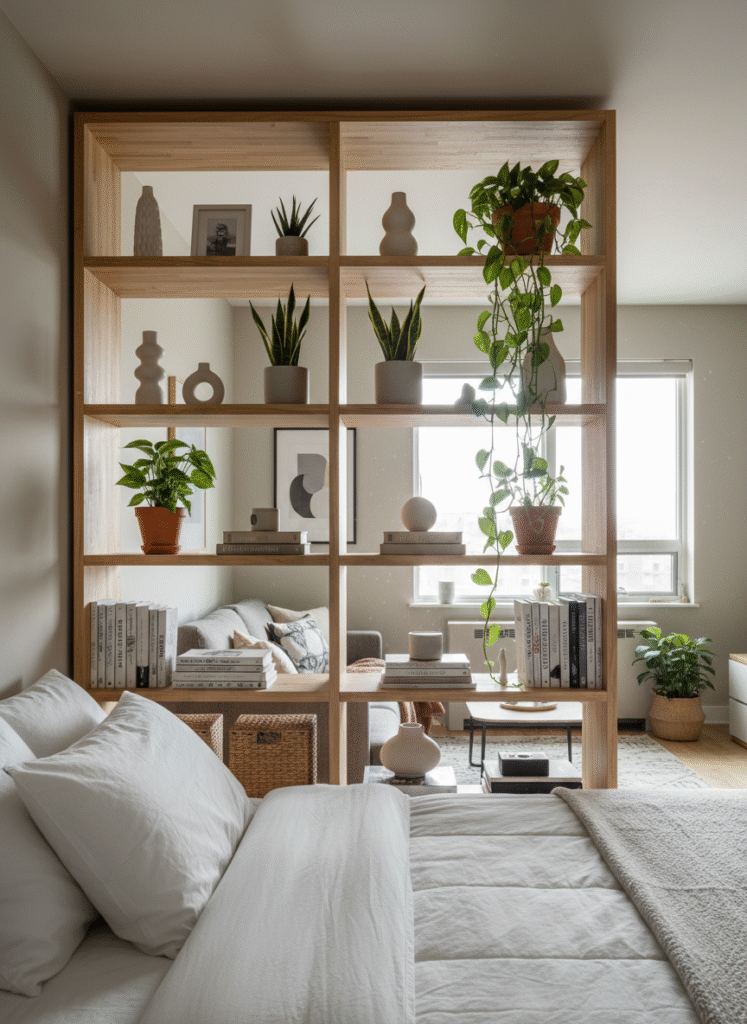 An open bookshelf divider instantly defines your bed area while keeping the studio feeling open and breathable. The vertical lines create visual separation, and the shelves add valuable storage and styling space. Keep the lower shelves functional and the upper shelves airy with plants and decorative pieces so the divider doesn’t overwhelm the room. This trick adds depth, coziness, and a beautiful focal point that feels intentional rather than improvised.