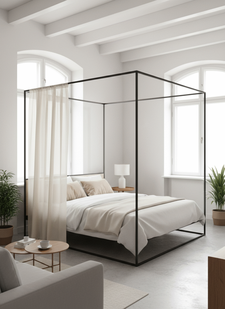 A canopy frame adds architectural drama to a tiny apartment—without needing walls. Drape soft fabric over one or two sides for privacy, or keep it clean for a modern loft vibe. The structure makes your sleep space feel like its own “room,” even in the most open layout. Stick to light, neutral fabrics to maintain a serene look that doesn’t weigh down the space.