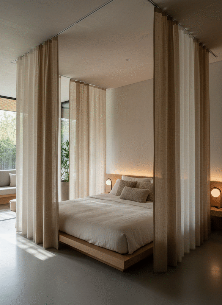 For a sleek, customizable privacy solution, sliding fabric panels create a flexible boundary around your bed. You can pull them open during the day or slide them shut at night for a cocoon-like calm. Choose textured linen or cotton panels that add a natural warmth. This approach gives the room a modern Japanese-inspired feel without sacrificing accessibility or light flow.