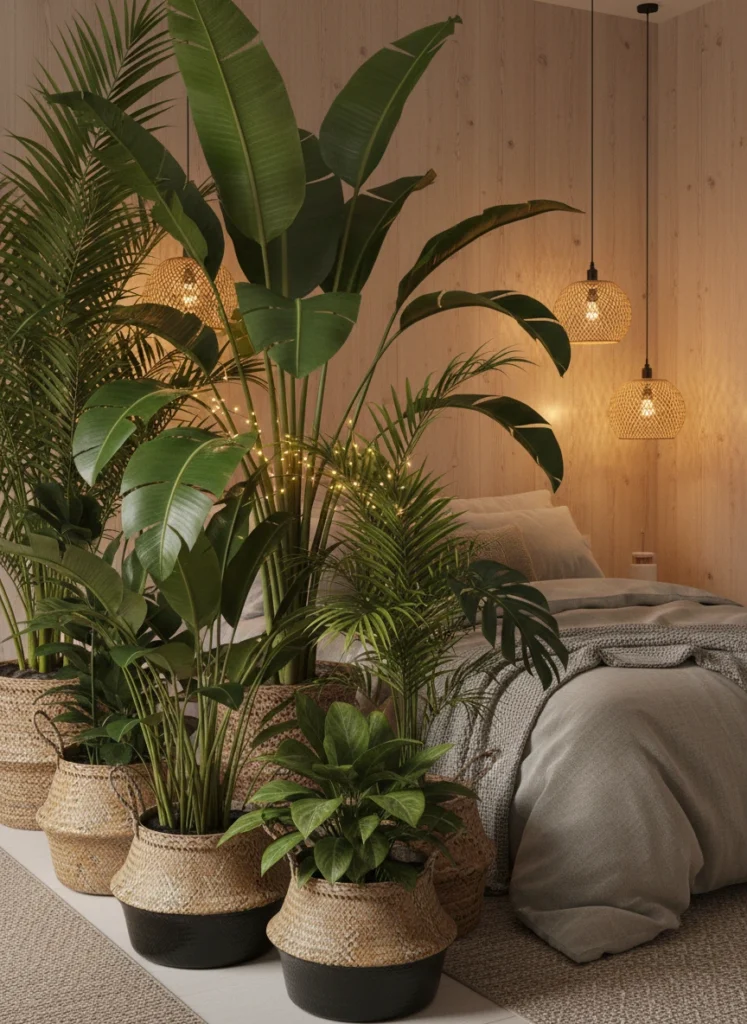 A cluster of tall plants makes a beautiful living privacy screen that doubles as décor. Place them in staggered heights along the edge of your sleep space to create a soft, organic boundary. Choose plants with full, broad leaves to maximize privacy—like palms or monsteras. Paired with woven baskets and warm lighting, your bed nook becomes a refreshing indoor oasis.