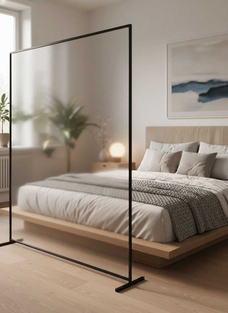 Portable frosted screens mimic the look of luxe architectural glass without requiring installation. They blur shapes and soften the sightline while still allowing light to filter through. Set one or two panels beside your bed for an elegant, minimal division. This style pairs beautifully with Japandi, Scandinavian, or modern interiors. It’s privacy without heaviness.