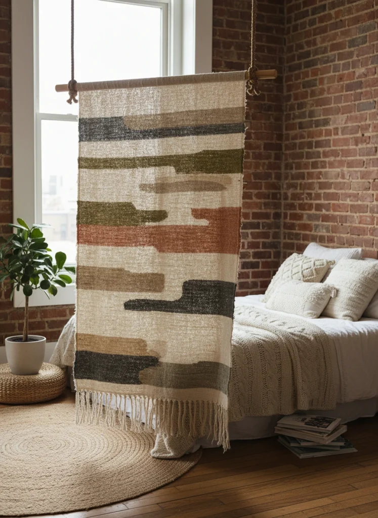 Suspend a large textile panel beside your bed to create an artistic, soft boundary. It adds character and warmth while offering just enough privacy to make the sleeping area feel defined. Choose natural tones, subtle patterns, or earthy textures that complement your studio’s vibe. The beauty of this method is how easily it can be changed out seasonally for a fresh look.