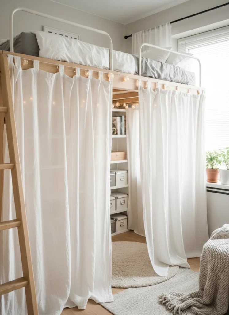 If you have a lofted bed, adding light curtains around the lower level gives you instant privacy—almost like a mini room within the room. The soft fabric creates a warm, cocoon-like retreat and doubles as discreet storage access. Opt for airy materials so the space stays bright and comfortable. This trick elevates both function and aesthetic with minimal effort.