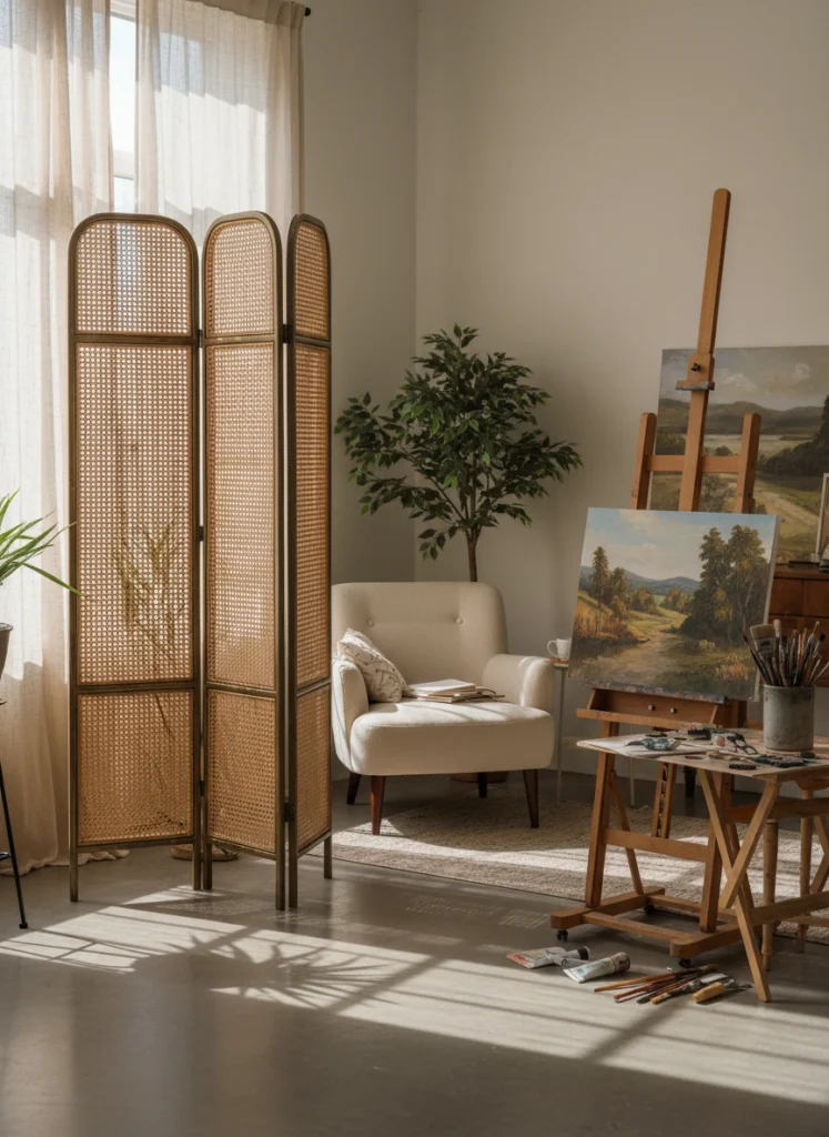 A folding screen is a timeless studio solution. It provides immediate privacy, adds aesthetic texture, and can be moved around easily based on the layout you need. Rattan, cane, or wooden slatted screens add warmth and depth, while fabric screens feel softer and more romantic. It’s both a visual anchor and a style statement.