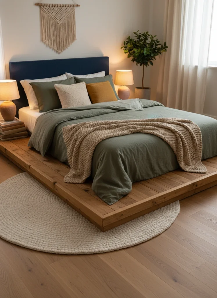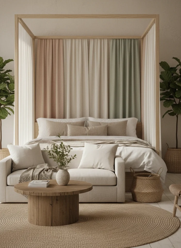 Installing a ceiling track across the room lets you pull privacy curtains exactly where you need them. It’s a simple, renter-friendly trick that instantly makes the bed feel tucked away. The key is choosing fabric that complements your palette—oatmeal linens, soft whites, or muted taupes. When open, they blend into the room; when closed, the sleeping area feels instantly serene.