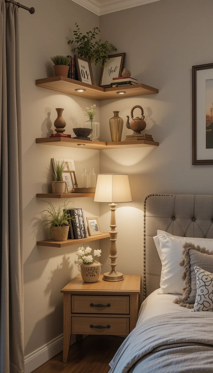 Corners are often ignored, but in a small bedroom they can quietly change everything. Floating shelves stacked upward turn an awkward angle into a place that feels intentional and calm. Instead of clutter spreading across every surface, your favorite books, plants, and personal objects get a home that doesn’t steal floor space.