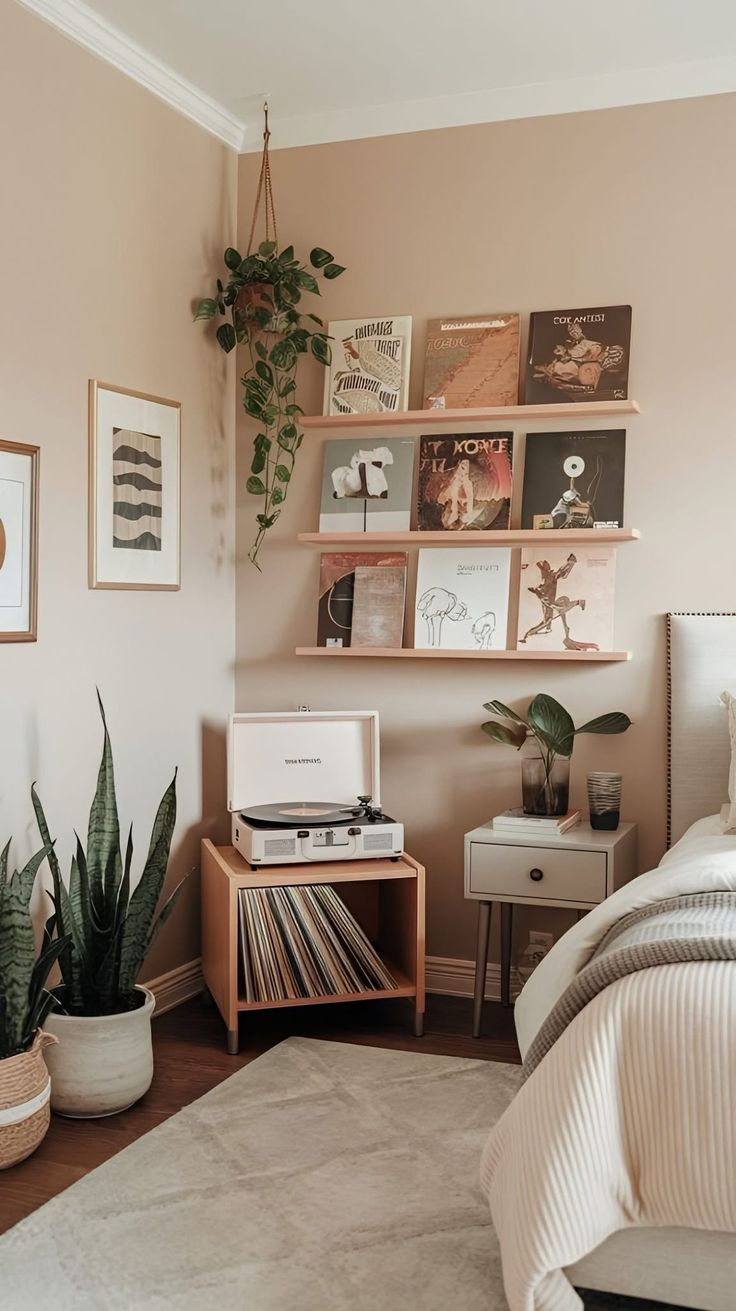 A small bedroom feels more meaningful when it reflects who you are, not just how much space you have. Using wall space for art, records, or books adds personality without making the room feel crowded. Everything lives vertically, which keeps the floor open and the energy calm.