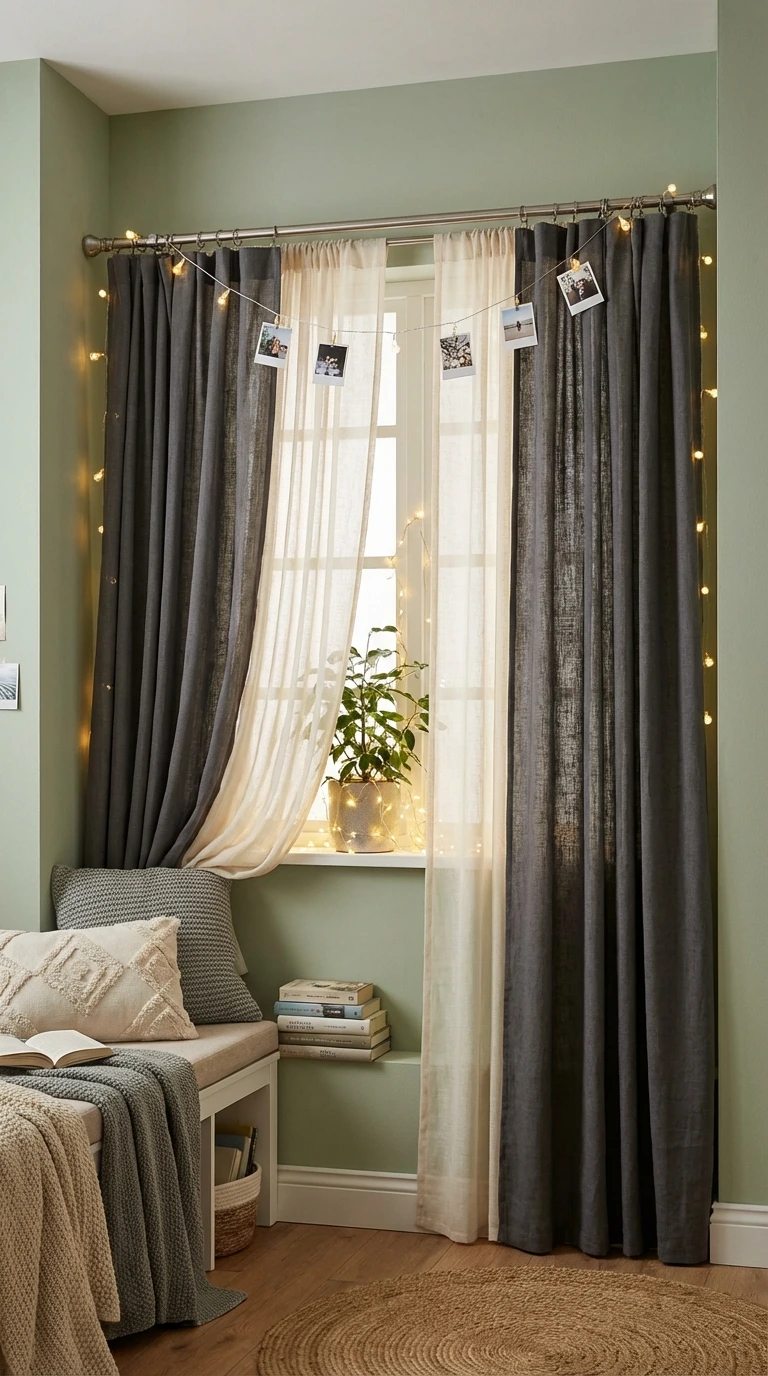 7) Swap harsh dorm vibes for soft curtains (even if you cannot drill)