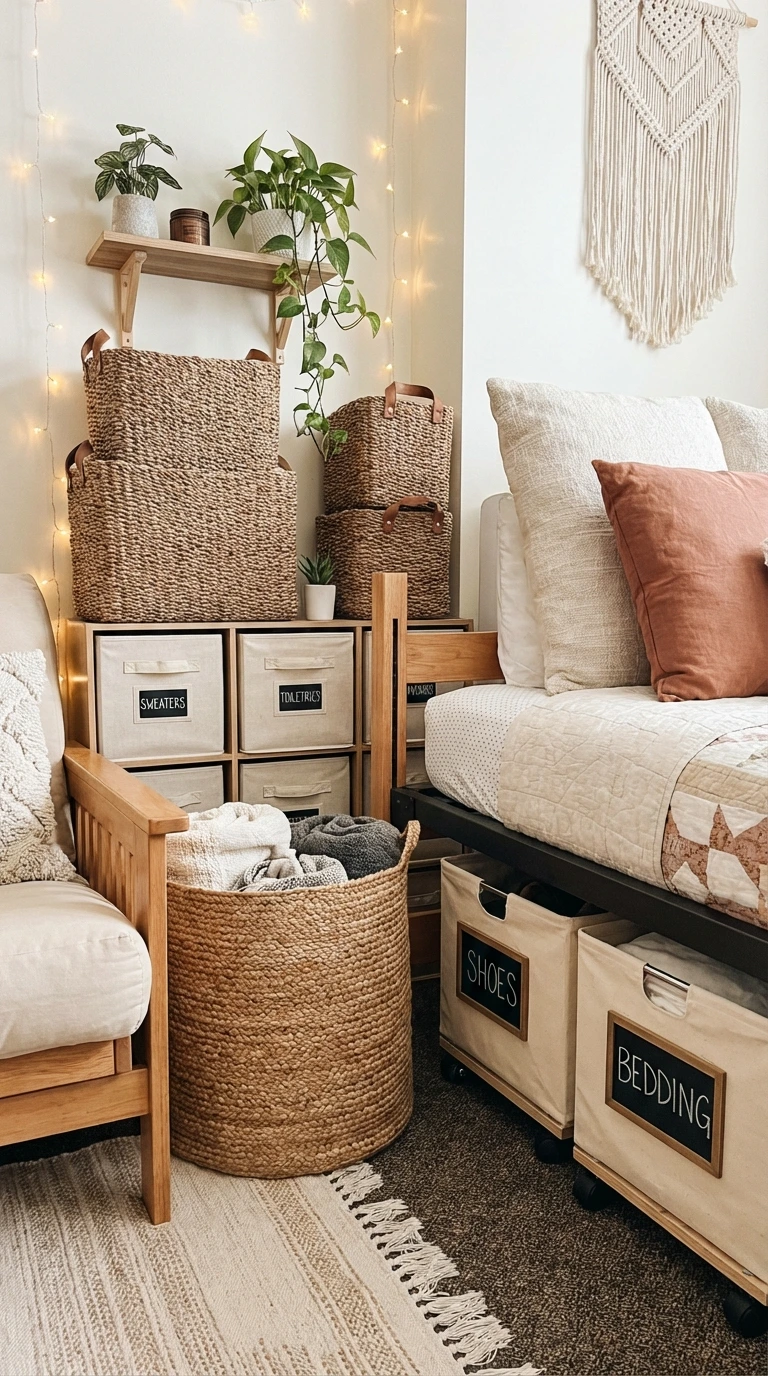 Dorm room ideas clean aesthetic tip: Choose one bin style and repeat it. Matching storage makes your room look 10x tidier with zero extra cleaning.