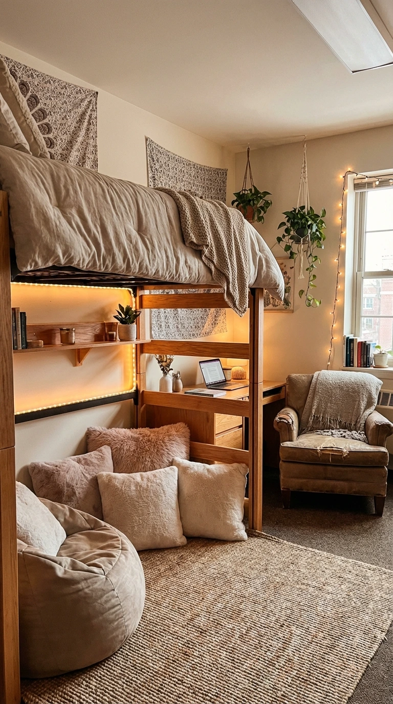 Lofted bed dorm room ideas aesthetic can look incredible, not like a bunk bed in a summer camp.
