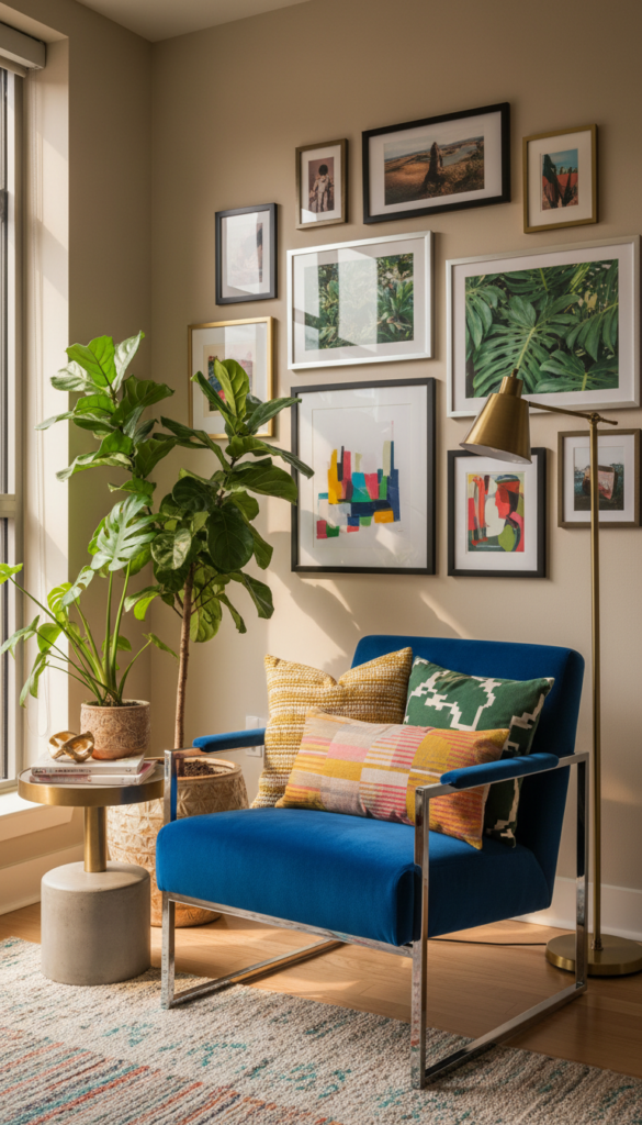Inject personality into your space by designing a vibey apartment corner. This involves strategic use of color, texture, and unique art pieces to create an energizing focal point. An aesthetic living room is all about personal expression.Why it matters: A vibrant corner can transform the mood of your entire living room, making it feel more dynamic and inviting. It’s a great way to express your unique aesthetic.Introduce elements like:A bold accent chairA gallery wall with diverse artworkColorful throw pillowsLush green plantsThis creates an instantly engaging and artistic living room inspo apartment. Consider layering different lighting sources for depth.