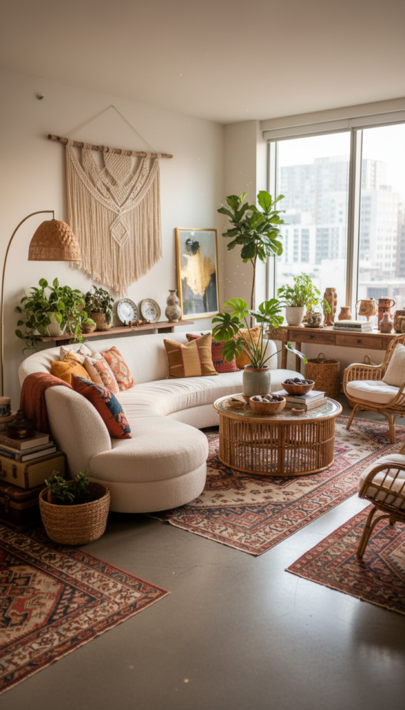 Unleash your inner free spirit with a bohemian apartment living room inspiration. This style thrives on layers, patterns, and natural elements, creating a globally-inspired and relaxed vibe. It’s about feeling lived-in and loved.Why it matters: Bohemian decor allows for eclectic self-expression, blending different cultures and textures seamlessly. It’s a fantastic cozy boho living room inspiration apartment.Key bohemian elements include:Rattan furnitureMacrame wall hangingsPatterned textiles such as rugs and pillowsIndoor plants in varying sizesConsider vintage finds and handcrafted items to enhance this unique apartment living room aesthetic. This creates a deeply personal and warm apartment aesthetic. Make it your dream apartment decor by collecting pieces over time.
