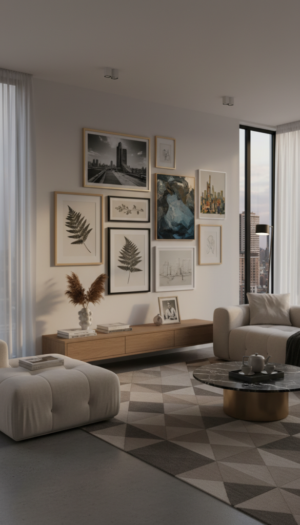 Create a captivating focal point with an artful gallery wall statement. This allows for personal expression and introduces visual interest without taking up floor space. It’s a fantastic way to elevate your aesthetic living room.Why it matters: A well-curated gallery wall adds personality and depth, telling a visual story about your tastes and experiences. It can be a great piece of apartment decor inspiration living room.To design your gallery wall:Mix different frame sizes and stylesIncorporate various art mediums (prints, photos, mirrors)Plan your layout on the floor first before hangingThis strategy works well for apartment inspiration living room simple. It’s a budget-friendly way to make a significant decor impact and can be a central element of your dream apartment decor.