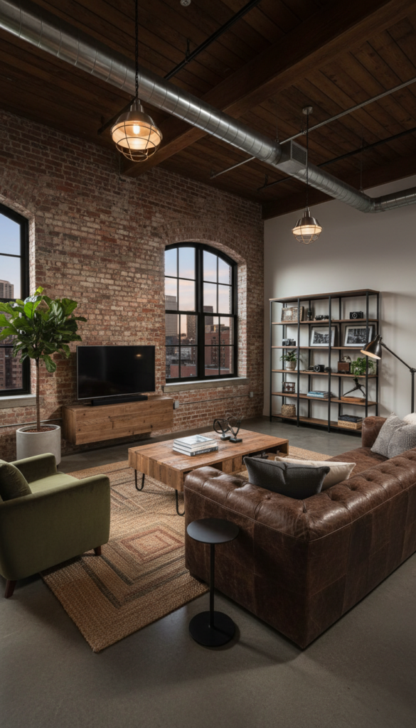 Bring urban edge to your space with an industrial chic loft look. This design celebrates raw materials, exposed elements, and a sophisticated, unfinished aesthetic. It’s a modern interpretation of a classic style, perfect for apartment living room inspiration modern.Why it matters: Industrial chic adds character and rugged elegance, making a bold statement in any apartment living room. It works particularly well in spaces with high ceilings or exposed brick.Key features include:Exposed brick or concrete accentsMetal shelving and lighting fixturesLeather upholstery in rich tonesReclaimed wood furnitureThese elements create a cool, urban living room inspo apartment vibe. Think concrete floors or large windows for a complete modern apartment aesthetic.