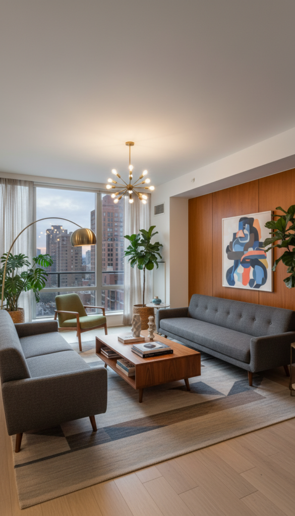 > Pro Tip: Incorporate a classic Sputnik chandelier or an Eames Lounge Chair replica to instantly capture the Mid-Century vibe.