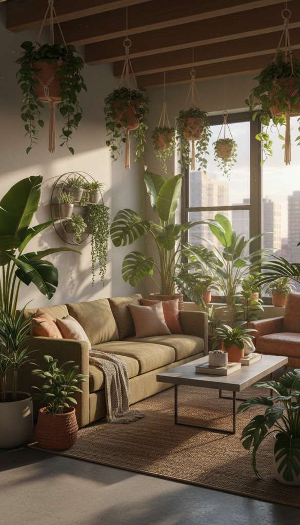 Transform your living room into a lush urban jungle escape. This trend brings the outdoors in, using an abundance of plants to create a vibrant and refreshing atmosphere. It’s a unique apartment aesthetic cozy choice.Why it matters: Houseplants improve air quality and boost mood, while adding incredible texture and life to your apartment living room. They create a warm apartment aesthetic.Fill your space with:Varied plant species in different sizesHanging planters and plant standsNatural materials like terracotta and woodEarthy-toned textilesThese elements contribute to a refreshing living room inspo apartment. Consider a mix of tall floor plants, smaller table plants, and cascading hanging plants for depth.