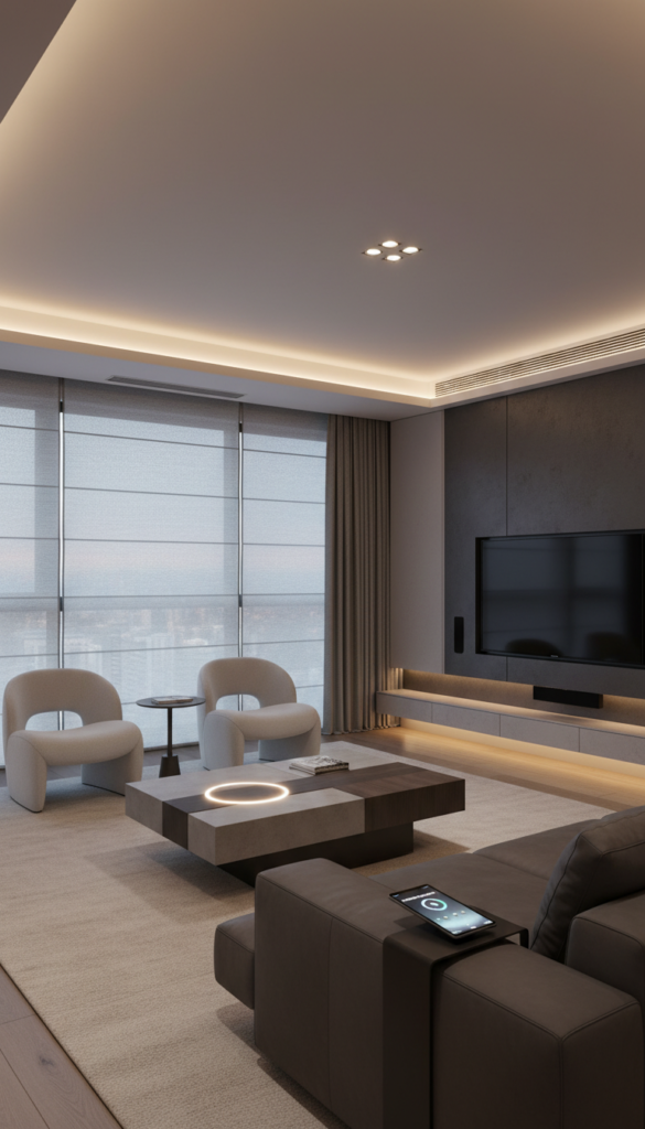 Design a tech-integrated smart space where modern convenience meets sleek aesthetics. This focuses on seamlessly incorporating technology into your living room design for comfort and efficiency. It’s a perfect example of a modern minimalist living room apartment inspiration.Why it matters: Smart home technology simplifies daily routines and enhances entertainment, offering convenience at your fingertips. It creates a highly functional, future-forward apartment living room.Consider these integrations:Hidden wiring for TVs and sound systemsSmart lighting that adjusts with voice or app controlMotorized blinds or curtainsWireless charging stations incorporated into furnitureThese subtle additions maintain a clean look while providing maximum utility, ideal for an apartment inspiration modern living room. This is the epitome of effortless living.