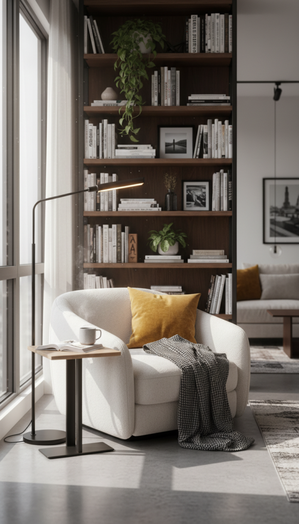 Carve out a personalized reading nook within your apartment living room. This cozy spot is dedicated to relaxation and literary pursuits, offering a quiet escape. It’s an ideal cozy living room design element for any apartment aesthetic cozy.Why it matters: A designated reading nook provides a peaceful retreat, encouraging mindfulness and relaxation in your own home. It truly enhances a cozy studio apartment.To create your nook, include:A comfortable armchair or chaise loungeExcellent task lighting (e.g., a floor lamp)A small side table for books and beveragesA soft throw blanket and a plush pillowThis creates a welcoming space within your living room inspiration cozy apartment, perfect for unwinding. Adding a small, curated bookshelf completes the vibe.